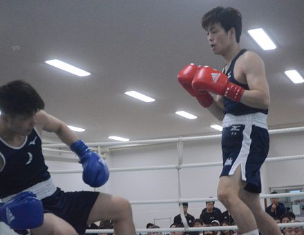 ライト級は吉田京太郎(4年)が鮮やかに右クロスでダウンを奪って、1回KO勝ちした。ライト級2人目の河野紘輝(4年)も右ジャブで距離を保って判定勝ち、勝利を決めて重量級もポイントを重ねた。