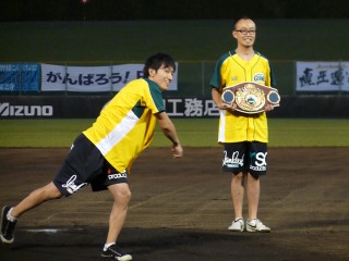 ■WBO・S・バンタム級4位の石本康隆(帝拳)が故郷の香川県で行われた「四国アイランドリーグplus」で始球式を行った。無事大役を務め終えた石本は「元サッカー部の僕にとって野球場のマウンドは凄く神聖で新鮮な場所でした。良い緊張感の中、ストライクを投げる事が出来ました! またこういう場所に呼んでもらえるように本業のボクシングの練習もしっかり頑張って行きますのでどうぞ宜しくお願いします」とコメント。=写真提供・帝拳ジム=