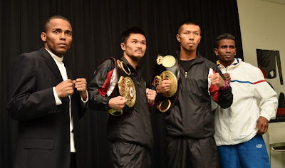 明日6日にゴングとなるダブル世界タイトルマッチの調印式と計量が5日、試合会場の大田区総合体育館で行われ、WBA世界S・フェザー級王者の内山高志(ワタナベ)、同S・フライ級王者の河野公平(ワタナベ)はそろってリミットちょうどでパス。内山の挑戦者ハイデル・パーラ(ベネズエラ)は100gアンダーで、S・フライ級挑戦者のリボリオ・ソリス(ベネズエラ)はリミットだった。