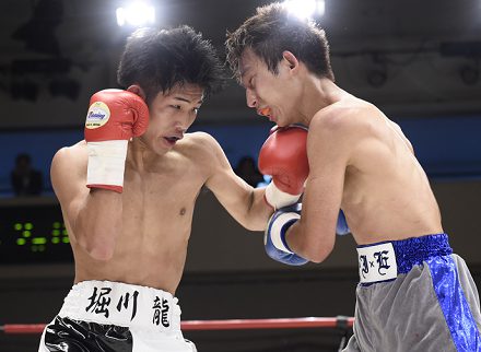 栃木・作新学院高で昨年のインターハイL・フライ級を制した堀川(アマ37勝8敗)のB級デビュー戦。初回、サウスポー石本の左をもらって一瞬腰が落ちたが、その後はよく動きながら次々とパンチを打ち込んでいった。3回に堀川が連打を決めたところでタオル投入。石本は5勝3KO7敗1分。