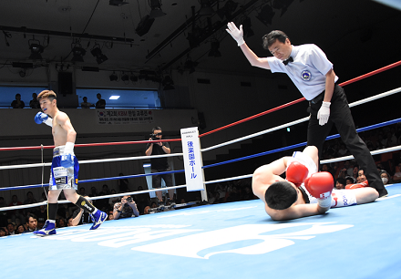 友松が初回から圧力をかけて打撃戦に突入。両者とも勇敢ながらディフェンスが甘く、お互いにヒット重ねた。3回に友松がイの右でグラついたが、ここから反撃。4回には左ボディを効かせて右でイをキャンバスにつき落とした。