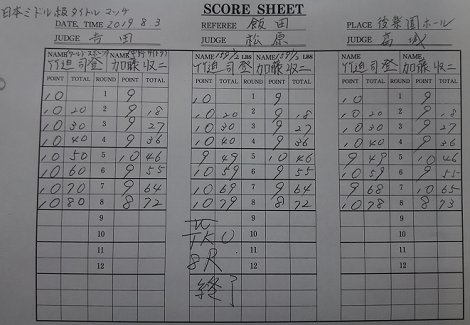 加藤は8回に攻めたが、流れを押し戻せず、ラウンド終了間際に立て続けにパンチを浴びてグロッギーに。最後は竹迫のパンチでコーナーに崩れ落ちた。