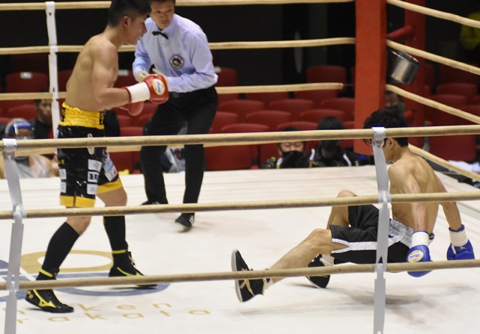 竹迫は2回もパワフルに加藤を押し込み、左右のボディを打ち込み、顔面はガードの上から強打を叩き込む。加藤はサイドに回って立て直そうとするが、竹迫の圧力をかわしきれない。