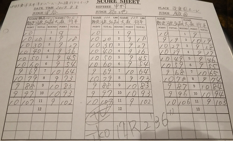 5回にヒッティングで右目上部をカットした大森は6回に左を決めて反撃開始。しかし打撃戦になると勅使河原が立て続けに右を決め、大森をダウン寸前に追い込む。ところが7回は大森が左ストレート、ボディブローで巻き返す。8回は勅使河原の右が決まり、8回終了時の採点は79-73×2、78-74で王者リード。