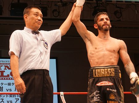 リナレスの話「いやー、相手はタフだった。頭が危ないね。一番ほしかったのは1、2ラウンド気を付けること。それは大丈夫だった。悪くはないけど、いい試合じゃなかった。(4ラウンドは)ちょこっときた(効いた)けど、みんなビックリしてたね。いま70%くらい。久々の日本でよかった。できたら年末に出たいね」
