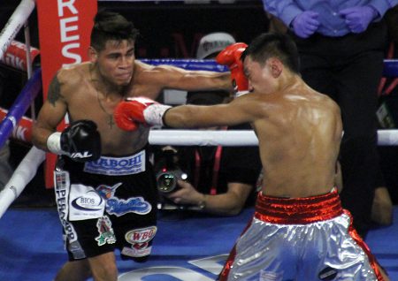 初回、フィリピンの英雄フラッシュ・エロルデの孫にあたる挑戦者が左ブローなどで積極的に仕掛けて健闘。しかしナバレッテは2回から体格とパワーの違いを見せつけて圧力をかける。3回、左構えにスイッチしたメキシカンはパンチを強振。手を出すエロルデだったが左フックを浴びてロープ間に腰を落とし主審はカウントを適用する。