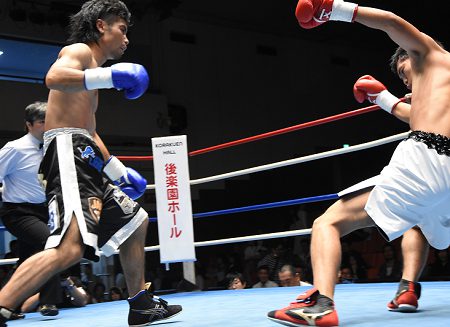 スピードのある亀田は距離を取って戦おうとした。初回は頭をつけてグイグイ前に出る小出にジャブ、アッパー、左ボディを打ち込んだが、2回に入るとファイターの小出にロープに押し込まれる展開になった。