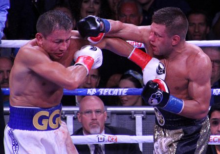 出血に見舞われるデレフヤンチェンコは3回ボディー打ちで反撃。4回以降も左右連打を返して一歩も引かない。5回にはウクライナ人の左ボディーでゴロフキンが効いた仕種を見せ会場が沸く。