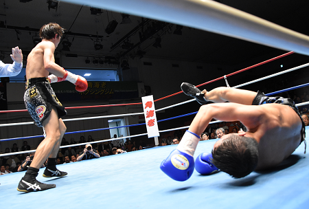 勝負に出た阪下が右を決めて望月を後退させると、さらにカウンターの右で望月がバッタリ。立ち上がったもののダメージが深く、10カウントが数えられた。