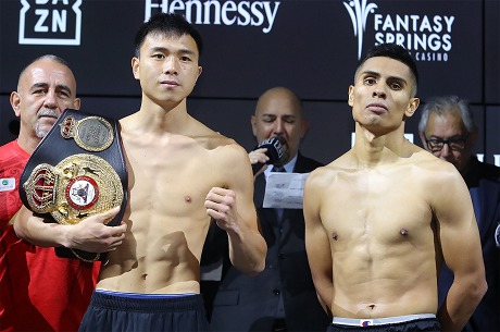 セミ格ではWBA世界フェザー級“レギュラー”王者シュ・ツァン(中国)が2度目の防衛戦。挑戦者はマニー・ロブレスⅢ(米)。戴冠試合と同じくマイアミのキューバ人トレーナー、ペドロ・ディアスに師事して調整したツァンは125.6ポンド(56.97キロ)を計測。ヘビー級王者アンディ・ルイスJrのトレーナー、マニー・ロブレスの息子のロブレスは計量1回目126.4ポンドだったがリミットの126ポンド(57.15キロ)に落とし事なきを得た。Photos/Tom Hogan-Hoganphotos/Golden Boy
