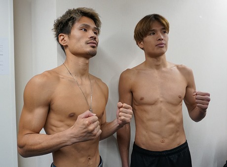 セミの日本S・フェザー級タイトルマッチは、WBO3位で王者の末吉大(帝拳=19勝11KO1敗1分)と、元日本フェザー級王者の挑戦者8位、坂晃典(仲里)がともにリミットの58.9キロであすの試合に進んだ。