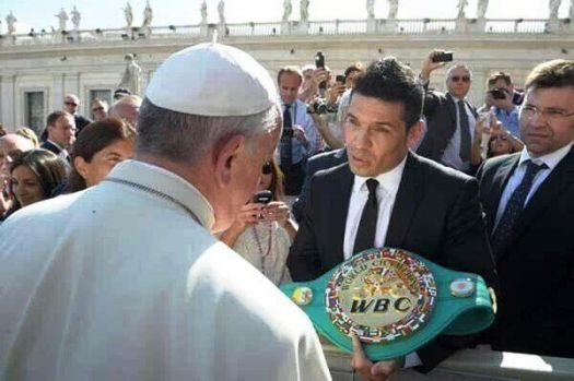 場所はカトリックの総本山バチカンのサンペドロ広場。現地ニュースでは、法王自身が主催したミサの後、マルティネスは33秒間にわたり法王と直に言葉を交わした。その後ミドル級王者はWBCベルトを贈呈。現役チャンピオンとして歴史に新たな1ページを記した。