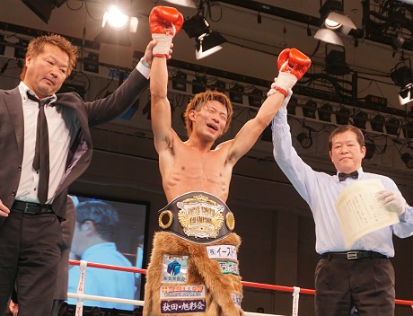 父が行事で相撲一家に育った波田は初タイトル獲得。「緊張しいでガチガチになっちゃうけど、(応援のおかげで)力を出せた」と喜んだ。10勝10KO1敗。石井は8勝5KO6敗1分。