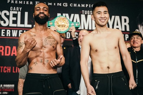 メインはWBCフェザー級王者のゲーリー・ラッセルJr(米)が指名挑戦者ツグスソグ・ニヤンバヤル(モンゴル)を迎えて5度目の防衛戦。計量はラッセルが125.1ポンド(56.74キロ)、ニヤンバヤルは125.7ポンド(57.01キロ)で合格した。