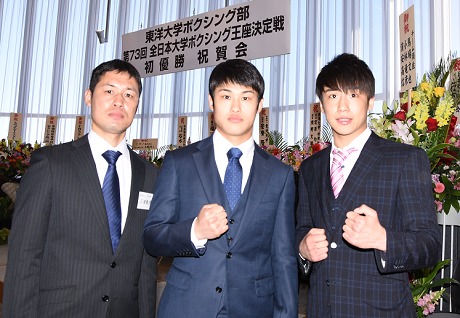 なお東洋大OBで五輪金メダリストから現在プロのWBA世界ミドル級チャンピオンとして活躍する村田(帝拳)は、同じ時間に世界ヘビー級タイトル戦のテレビ解説を務めたため、祝賀会に出席できなかった。祝賀会には同じくOBで現在プロとして活躍中の小原佳太(三迫)や高橋拓磨(ワールドS)らも駆けつけ、パーティーを楽しんでいた。