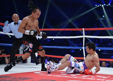 最新の1ラウンド王座陥落試合となると、2017年5月21日、有明コロシアムの八重樫東ということになる。IBF・L・フライ級王座の3度目の防衛戦。挑戦者はフィリピンのミラン・メリンドだった。