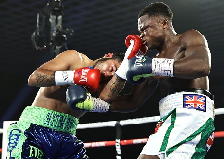 前座のフェザー級8回戦では、元WBO・S・バンタム級王者アイザック・ドグボエ(ガーナ)が元ランカー、クリス・アバロス(米)に最終8回2分25秒TKO勝ち。エマヌエル・ナバレッテ2戦から再起したドグボエは21勝15KO2敗。18年8月の大竹秀典戦以来の勝利を飾った。Photos: Mikey Williams / Top Rank