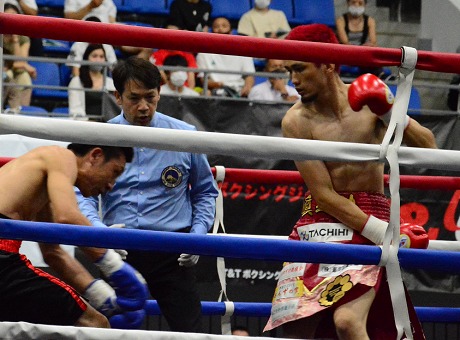 ノーランカーの高田が日本3位の佐宗に襲いかかった。初回から積極的に踏み込んでワンツーを打ち込むと、2回に右をかぶせて佐宗をキャンバス送り。高田はダメージの深い佐宗にたたみかけるが、クリンチを駆使した佐宗が減点1を食らいながら、2分以上のピンチを切り抜けた。