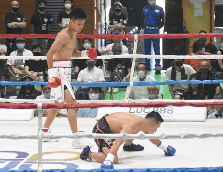 枚方市の試合のセミの8回戦は、元全日本新人王同士が激突した日本ユースS・バンタム級タイトル戦。ホームの下町俊貴(グリーンツダ)が金沢からやってきた挑戦者・英洸貴(カシミ)を5回左のボディーショットで倒した後、ラッシュしてレフェリー・ストップによるTKO勝ち。昨年獲得した王座の初防衛に成功した。