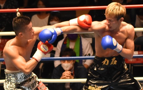 7月に日本L・フライ級王者となった兄の矢吹正道(緑)に続き、兄弟で王者を狙う力石は8勝4KO1敗。なかなかエンジンのかからなかった粕谷は13勝4KO3敗2分。