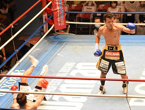 川島はここも立ったが、迎えた6回、和氣が相手の右の打ちざまを狙って繰り出した左ストレートがやはりカウンターとなって決まり、通算4度目のダウンシーンが生まれる。立ち上がった川島に染谷主審は10カウントを数えた。