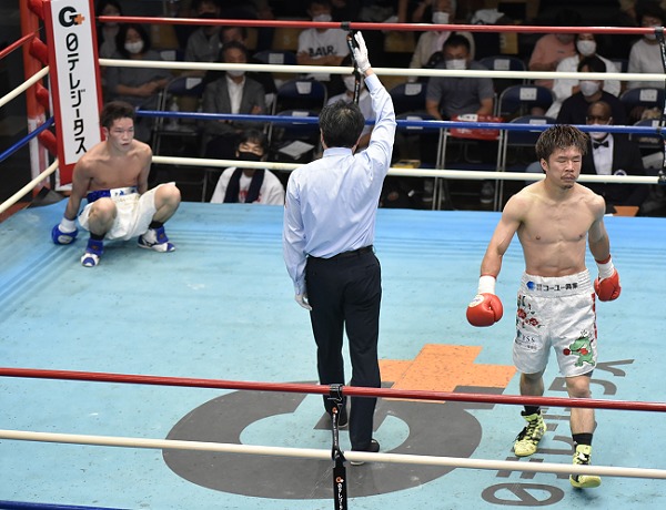 3回、先にチャンスをつかんだ野田がラッシュするが、ここから川満が逆襲。左ボディを効かせて畳みかける。野田が崩れるようにスリップダウンを繰り返すと、ラウンド終盤にダウンの裁定となった。川満は4回も攻め続け、両者の体がもつれても攻める。野田は打ち返すものの足に力が入らず、最後は主審に救われた。川満はデビューから5連勝(2KO)。プロ初黒星の野田は2勝2KO1敗。