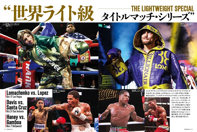 ワシル・ロマチェンコ(ウクライナ)とテオフィモ・ロペス(米)の対決がいよいよ迫る。このWBAスーパー・IBF・WBO王座統一戦を皮切りに、ジェルボンテ・デイビス(米)-レオ・サンタクルス(メキシコ)のWBA戦、デビン・ヘイニー(米)-ユリオルキス・ガンボア(キューバ)のWBC戦が立て続けに挙行される。ロマチェンコ-ロペス戦の直前情報とデイビス&ヘイニー戦の展望、そしてライト級の新しい勢力図までを占う。=ボクシング・ビート11月号より=