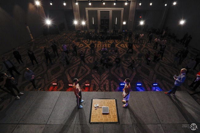 またIBFライト級2位決定戦はイサック・クルス(メキシコ)が132ポンド(59.87キロ)、相手のディエゴ・マグダレノ(米)が134.8ポンド(61.14キロ)でリミット135ポンドをクリアした。Photos from Esther Lin/SHOWTIME