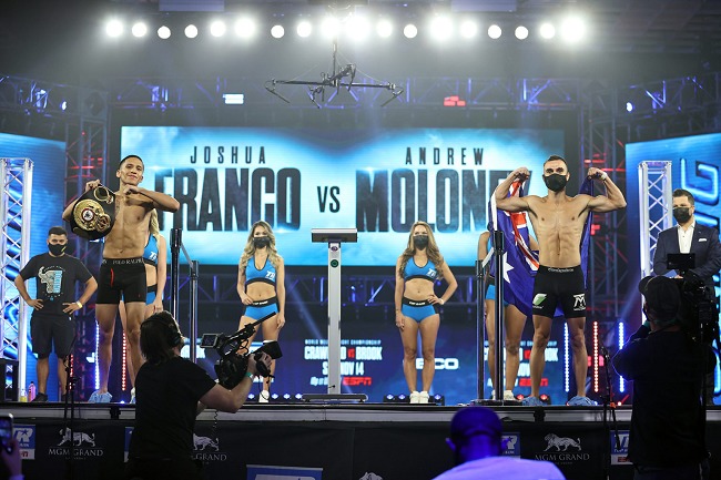 同じリングのWBA・S・フライ級レギュラー王座タイトルマッチはダイレクトリマッチ。王者ジョシュア・フランコ(米=17勝8KO1敗2分)が114.5ポンド(51.04キロ)、前王者アンドリュー・モロニー(豪州=21勝14KO1敗)が114.7ポンド(52.03キロ)を計測しリミット115ポンドを合格。WBAのスーパー王者にはローマン・ゴンサレスが君臨する。