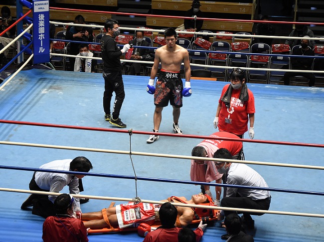 日本ライト級16位の高田と同17位の熊添の対決。ともにガードを締め、ジャブを差し合い、右、左ボディを狙うというオーソドックスな立ち上がり。ラウンド終盤、ロープを背負った熊添が左ボディで攻めたところに、高田の右アッパーが炸裂。大の字になった熊添は担架で退場となった。連続初回KO勝ちの高田は8勝5KO5敗2分。熊添は14勝5KO7敗。