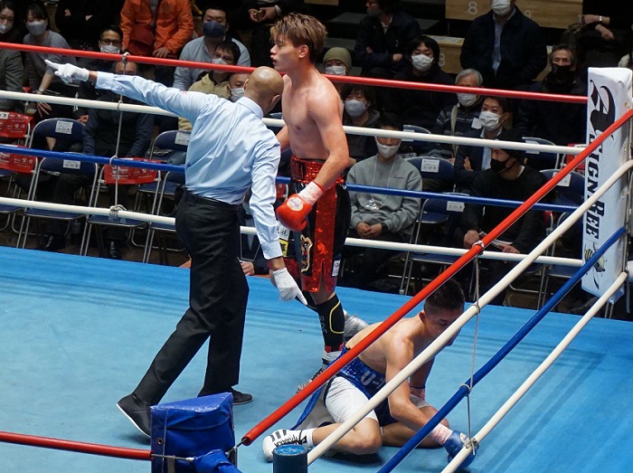 宮本は4回以降、左ストレートのタイミングを合わせ、右フックも決めてペースを掌握。宮本は5回に何度も左を決めると、6回には倒しにいくモードに。左を決めて諏訪をロープに追い込んだところでタオルが投入された。宮本は3連敗から脱出で7勝6KO5敗。諏訪は連敗で6勝1KO5敗。