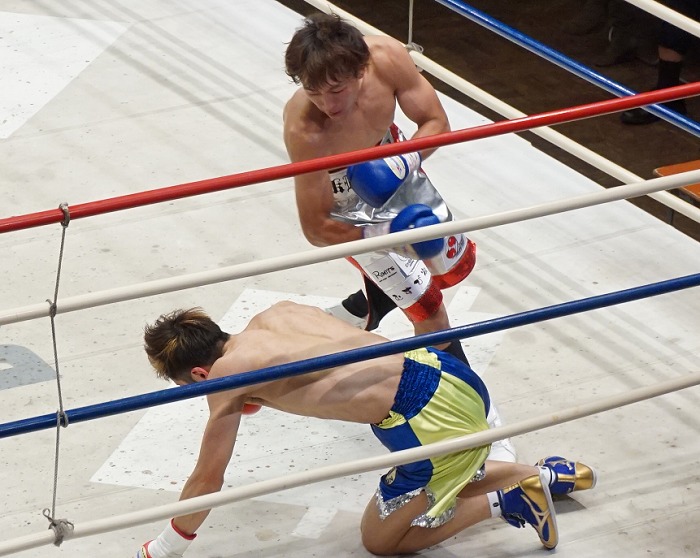 サウスポー対決。2度の世界挑戦経験がある小野がリングを広く使い、リーチのない薮崎が追いかける立ち上がり。2回早々に左の相打ちで小野がダウンした。薮崎はKOを狙うが、ここはうまく小野がしのいだ。