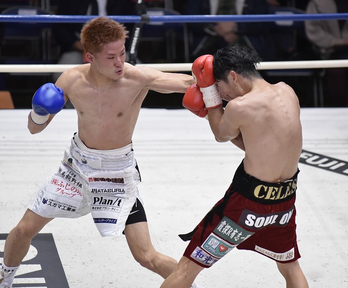 日本バンタム級19位の村地と日本S・フライ級11位の青山。両者とも左の差し合いから積極的に右を狙っていった。2回からは村地が攻撃のバリエーションを増やし、ボディ攻め、右アッパー、右ストレートで青山に迫る。青山も右を決めて応じるが、村地は圧力をかけ続けた。