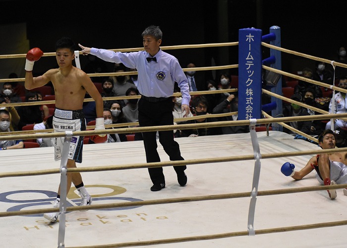 グリーンツダのホープ、19年全日本フェザー級新人王の前田が立ち上がりからジリジリプレッシャーをかけて、2回にロープに詰めたところに左ストレートを浴びせた。あごに受けた大久保は大の字にダウン、カウント途中で試合はストップ。前田のシャープなパンチが光った。前田は6勝4KO。大久保は5勝2KO2敗。