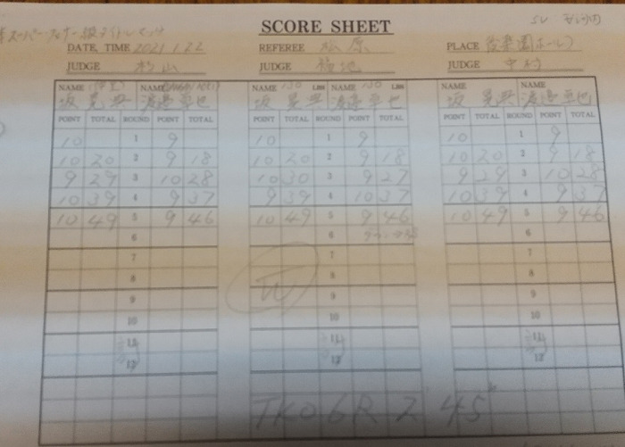 坂は4回に偶然のバッティングで左目上部から出血。5回にドクターチェックが入ったあと、坂がスパートするが、渡邉はジャブとボディ打ちで応戦して踏みとどまる。5回を終わっての採点は3者ともに49-46で坂のリードとした。