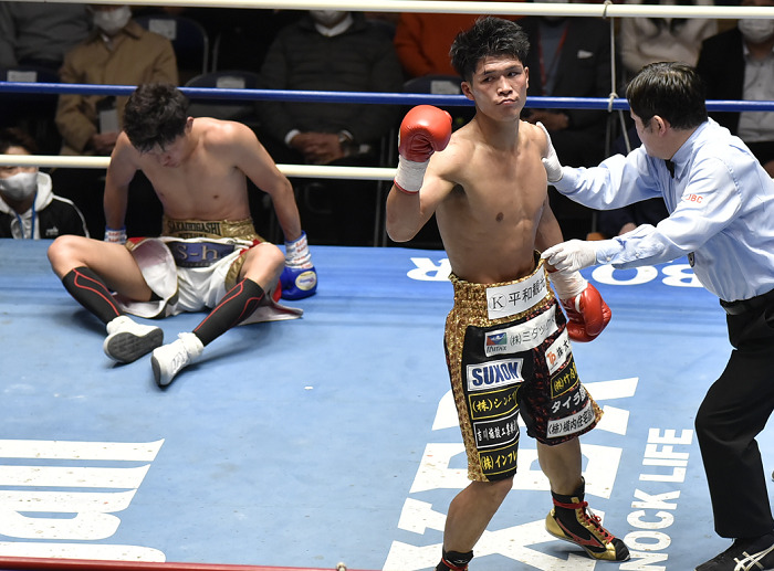 両者ともに距離が遠く、パンチがなかなか届かない立ち上がり。サウスポーの三尾谷は左ストレートを狙ったが、中盤から木村がカウンターの右と左フックを断続的に決めた。木村は6勝2分。三尾谷は8勝2KO2敗2分。