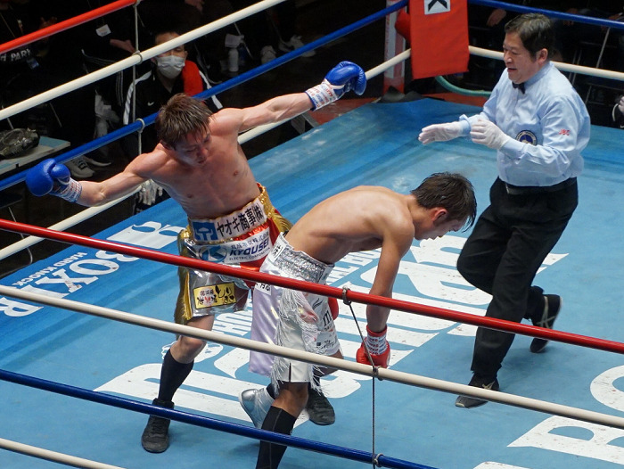 4回、やや劣勢の古橋が距離を詰めて右を決めると久我の動きが止まった。古橋はすかさず畳みかけるが、久我もこらえて応戦。5回は久我が再び右ストレート、ボディ打ちで攻めるものの、古橋のアタックで動きが止まるシーンがあり危なっかしい。5回終了時の採点は48-47×2、49-46で久我がリードした。