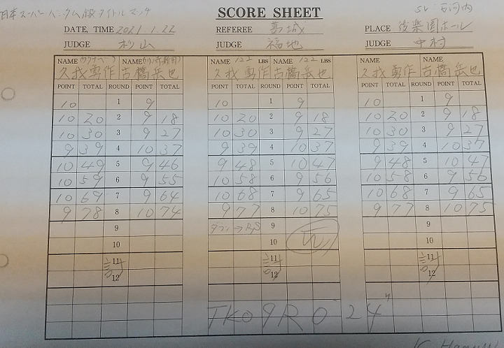 久我は6回、うまく距離を保ちながら戦い、7回には連打で古橋に襲いかかる。あとのない古橋は8回、前に出てボディ攻撃。これに耐えた久我が終盤にコンビネーションを決めるが、終了間際に古橋の右が決まって久我が一瞬棒立ちの状態になった。