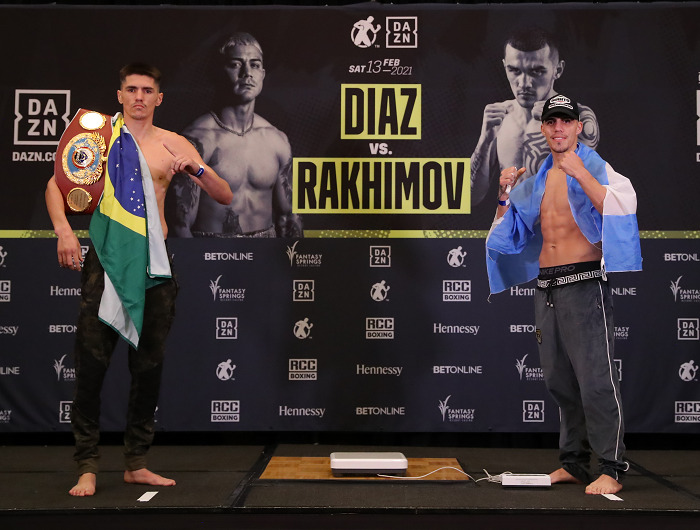 明日はラヒモフ(15勝12KO=26)が勝利を収めた場合のみ新王者誕生となる。ディアス(31勝15KO1敗=28)は18年のWBAフェザー級王座挑戦試合でもオーバーウエートを犯している。カリフォルニア州アスレチック・コミッションはディアスからファイトマネーの20パーセントに当たる10万ドル(約1050万円)をペナルティーとして徴収。同コミッションとラヒモフ側で折半する。