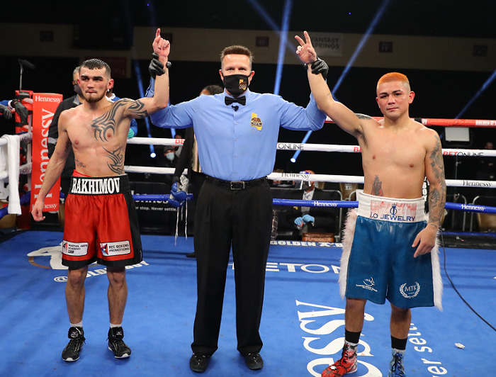 すでにベルトを失い、カリフォルニア州コミッションから罰金も科されたディアスのモチベーションが心配されたが、初回、2回に左をを決めて先制する。しかしサウスポー対決は3、4回ラヒモフが挽回し振出しに戻る。