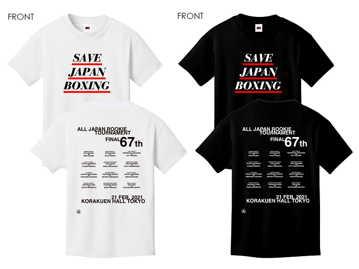 Tシャツはフロントが日本プロボクシング協会の展開するプロジェクト「SAVE JAPAN BOXING」のロゴ、バックに対戦カードがプリントされている。白と黒の二色で価格は4500円。売り上げはコロナ対策資金にあてられる。