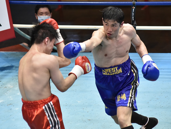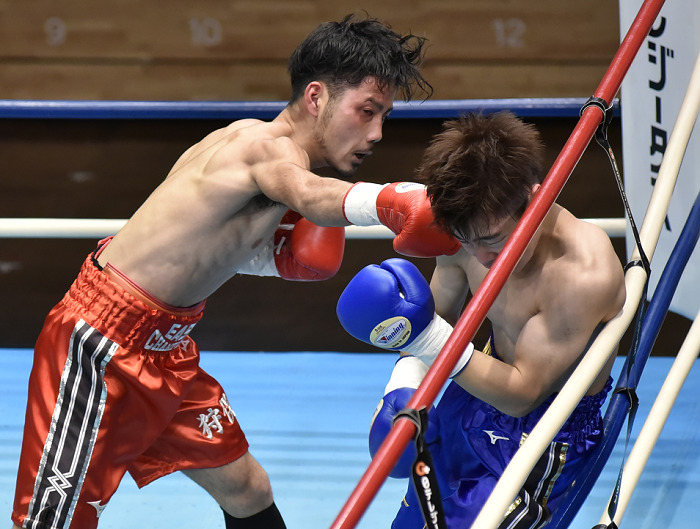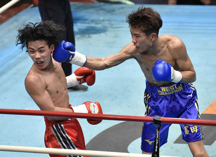 互いに好戦的なボクシングでワンツー、左フックを打ち合い、白熱した試合を展開した。しかし馬力に勝る久保が3回にピッチを上げ、4回に右を決め手猛ラッシュを敢行。杉本は倒れなかったが、主審が試合を止めた。東日本決勝MVP、鹿児島県喜界島出身の久保は7勝5KO1敗1分。杉本は6勝1KO1敗1分