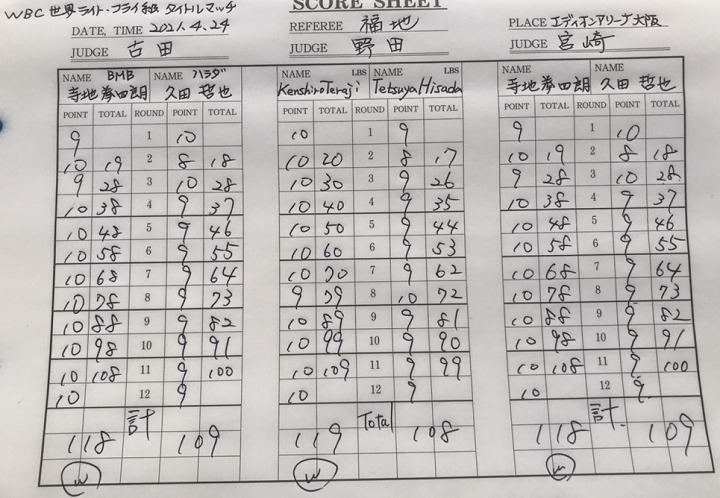 終盤も拳四朗のペースは落ちなかった。何とか逆転したい久田は前に出て手を出していくが、拳四朗はジャブを起点に先手、先手で久田に思うようなボクシングを許さない。久田は最後まで闘志を見せ、単発でパンチをヒットすることはあったものの、拳四朗のうまさが上回った。拳四朗は18勝10KO。