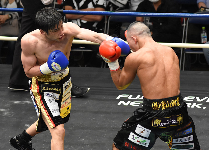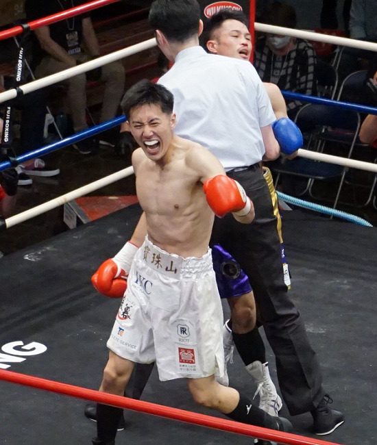 サウスポー対決は2020年全日本フライ級新人王で日本同級15位の宝珠山が初回、いきなり左アッパーを決め、そのまま左をフォローすると川畑がダウン。宝珠山はここから2分以上攻め続け、川畑はクリンチでなんとかしのいだ。しかし2回、宝珠山が左を決めて畳みかけたところでストップとなった。名門、日大出身ながら大学時代は無名の宝珠山はデビューから6連勝(3KO)。日体大出身の川畑は3連敗で2勝2KO3敗。