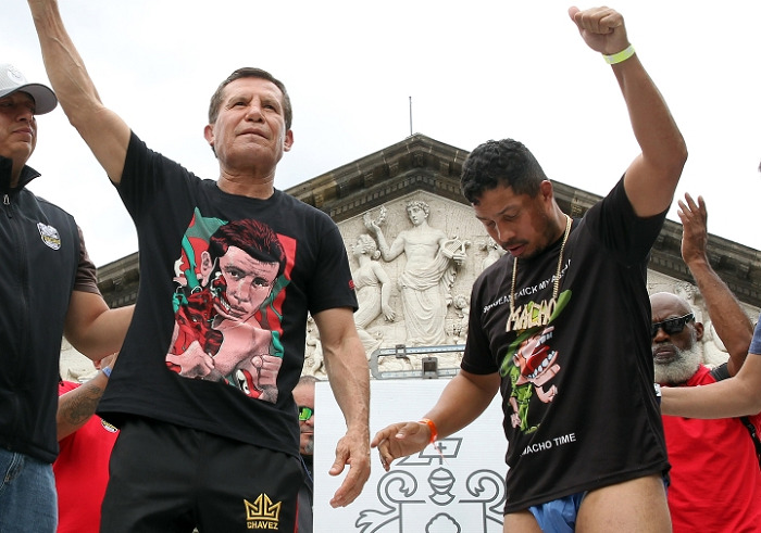 チャベス父は143ポンド(64.86キロ)と現役時代最後と変わらぬか、むしろ軽い体重。カマチョJrはミドル級リミットの160ポンド(72.57キロ)をマークした。試合は8回戦になる見込みで、ヘッドギアが着用されるもようだ。