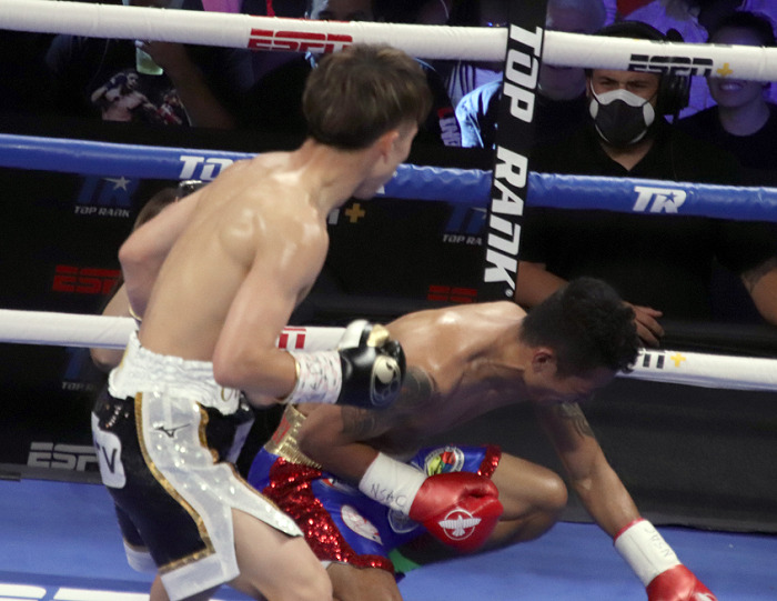 3回、セコンドの井上真吾トレーナーから「ボディ!」の声が聞こえたのか、井上が右アッパーから左ボディを打ち込むと、ダスマリナスが悶絶するかのようにダウン。ここを何とか立ち上がったのはダスマリナスの意地だろう。挑戦者は懸命に手を出し、サバイバルを狙ったが、井上から三度左ボディを食らうとキャンバスに崩れ落ち、レフェリーがノーカウントで試合を止めた。井上は21勝17KO。ダスマリナスは30勝20KO3敗1分。