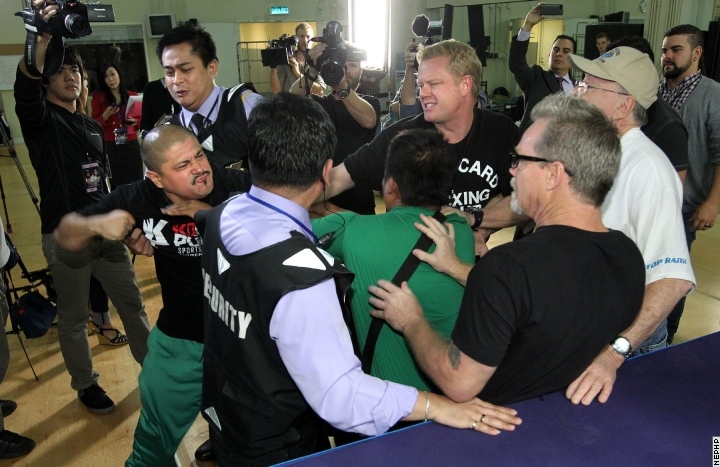 ESPNドットコムなどの報道によると、午前9時から11時までのリオスの練習時間が終了する直前にパッキャオのフレディ・ローチ・トレーナーが到着。リオスのロバート・ガルシア・トレーナーに場所を明け渡すように要求したが、ガルシア氏はインタービューの時間が延びたことなどを理由に要求を拒否。すると口論は“Fワード”を交えた罵りあいに発展し、以前パッキキャオのコンディショニングコーチを務め、現在リオス陣営に加わったアレックス・アリサ氏も“参戦”し、なんとキックを見舞う場面も。ガルシア氏のサポート・トレーナーがローチ氏に殴りかかろうとして警備員に止められるシーンもあった。