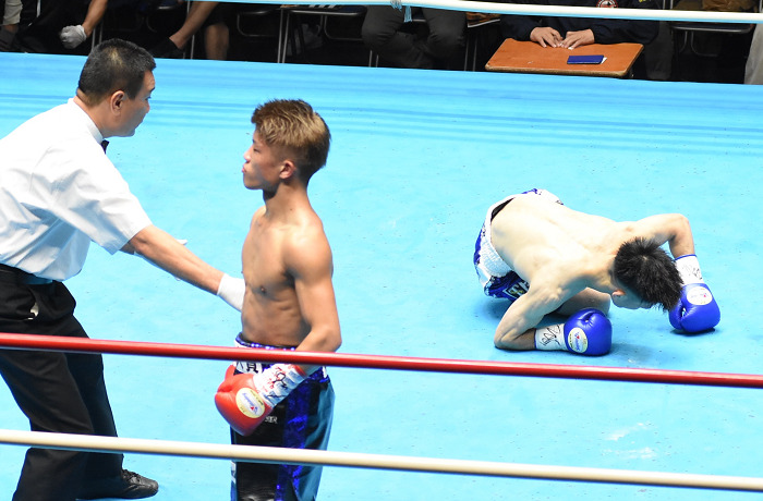 立ち上がった川満は重岡の追撃をしのぎ、打ち返して出る。そこにまたしても重岡の右フック。同じようなパンチでグラリときた川満に左ストレートのフォローが入るところ、福地主審があわてて割って入った。