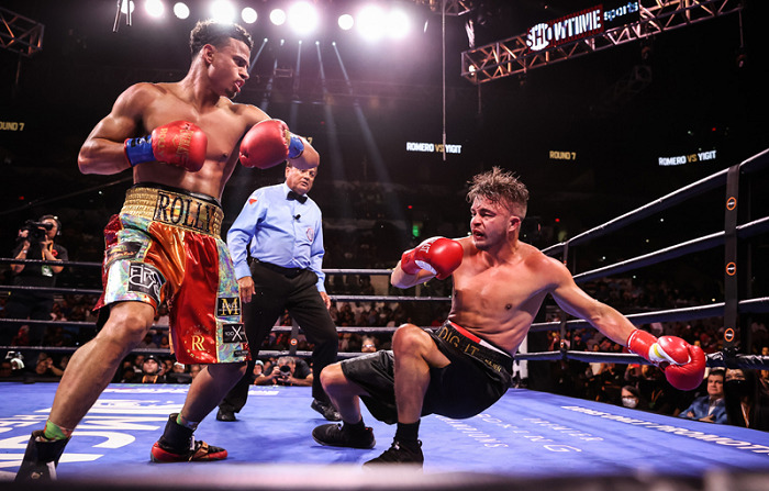 セミのWBAライト級暫定王座タイトルマッチは、ローランド・ロメロ(米)が前日の計量で体重オーバーしたアンソニー・イギット(スウェーデン)を6回に一度、7回に2度倒して7回1分54秒TKO勝ちで防衛。またアミルカル・ビダル(ウルグアイ=WBAミドル級14位)が元ランカー、イマヌウェル・アリーム(米)に10回2-0判定勝ち。スコアは97-93×2、95-95でビダル。Photos from Amanda Wescott / Showtime