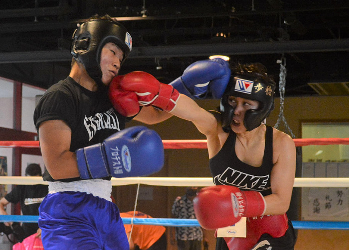 この日はジムで指導する16歳の高校生や32歳の元プロ選手をはじめ、理学療法士の女子選手、村上歩稔(あゆみ=26)ら7人が受験した。村上さんは近畿大ボクシング部出身の柳井妃奈実(真正)に相手を務めてもらい、懸命に右ストレートを打ち込み、テストをパスした。